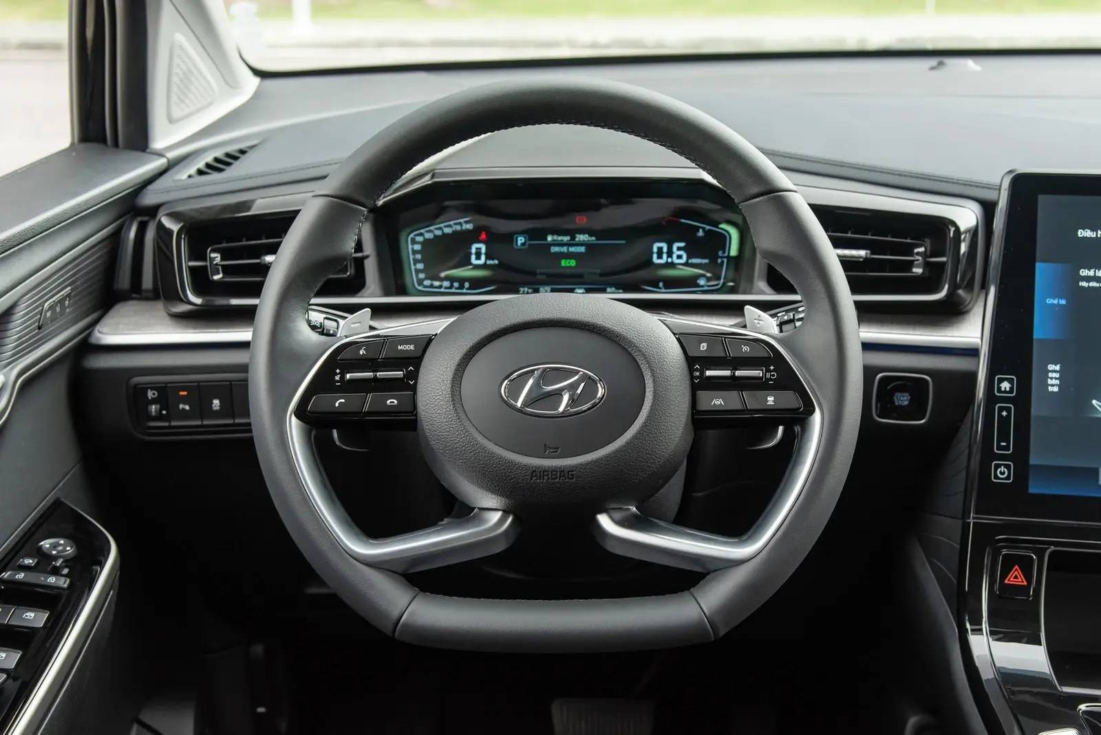 Trên vô lăng tích hợp lẫy chuyển số thể thao, đàm thoại, giải trí và điều khiển hành trình thông minh. Phía sau vô lăng Hyundai Custin 1.5L Đặc Biệt là cụm đồng hồ lái kỹ thuật số với giao diện tùy biến linh hoạt.