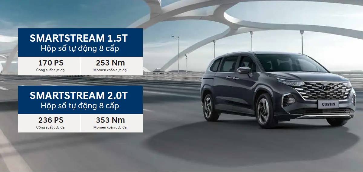 Hyundai Custin được phân phối ở Việt Nam với 2 phiên bản động cơ bao gồm: Động cơ Turbo 2.0L GDi (G4NIII) công suất tối đa 236 mã lực và 353Nm mômen xoắn. Phiên bản thứ 2 là động cơ 1.5L Turbo GDi (G4FII), công suất tối đa đạt 170 mã lực và 253 Nm Mô-men xoắn. Cả hai phiên bản động cơ đều sử dụng hệ dẫn động cầu trước và hộp số tự động 8 cấp.
